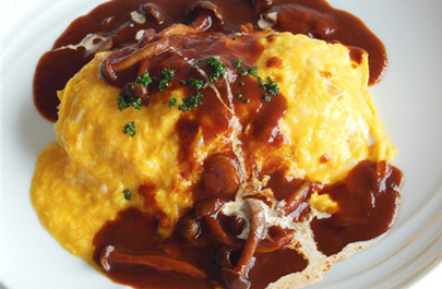 写真の「ふわとろオムライス」は大人気メニューで、味・価格は申し分なく、こだわりの食器がそれをさらに引き立たせています。
