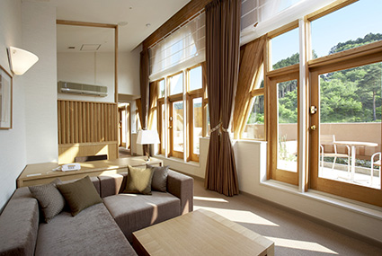 中部銀次郎氏監修のゴルフコースと温泉大浴場や露天風呂などのクア施設(松ケ沢温泉)のほか、シェフが地産地消にこだわった食事が愉しめるレストラン(ダイニング&カフェTHE GRILL)、そして夕食後もお客様を飽きさせないシアタールームなど多彩な愉しみと癒しの快適空間が充実。