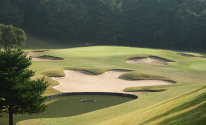 立地は丘陵だが一見してリンクスを彷彿とさせるコース。アウトの4番・5番は右が下り斜面で左に大きな池、6番はティから270ヤード付近まで左側に大きなバンカーが続く。9番はグリーンの傾斜が左手前をガードする池に向かっているので上からのパットは要注意。インも、230ヤード地点からグリーンまでムーンクレーターと呼ばれるバンカー群のある13番からは距離のある14番・15番、フェアウェイ左側に大きな池の続く16番、アイランドグリーンの17番、第3打が滝越えとなる18番と難ホール続き。