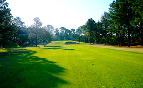 最後まで左にゆるやかにカーブするロングホール。右側から攻めてコースを広く使いたい。