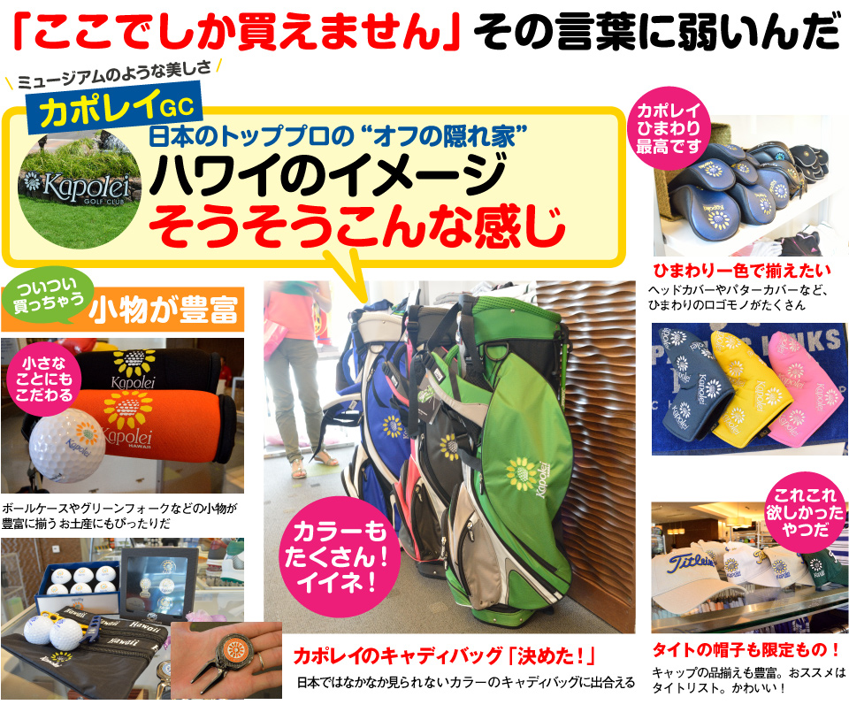“ひまわり”がトレードマークのカポレイだが、ショップにはロゴ入りの品物がずらりと並ぶ。中でも目に付くのは爽やかなカラーのキャディバッグ。